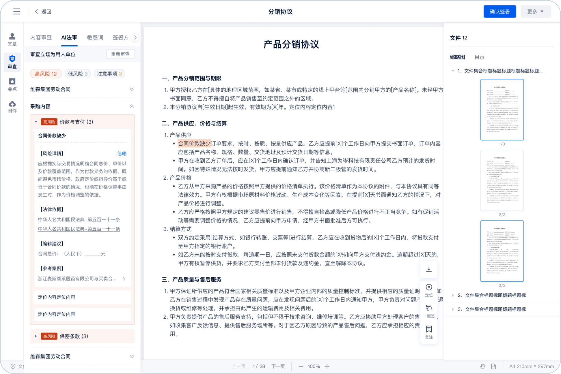 · AI智能法审,高效锁定风险:帮助法务自动识别合同条款风险,结合权威案例库裁判依据自动生成法律文书初稿、审查依据、评估依据以及修改意见,高效辅助法务审查。
