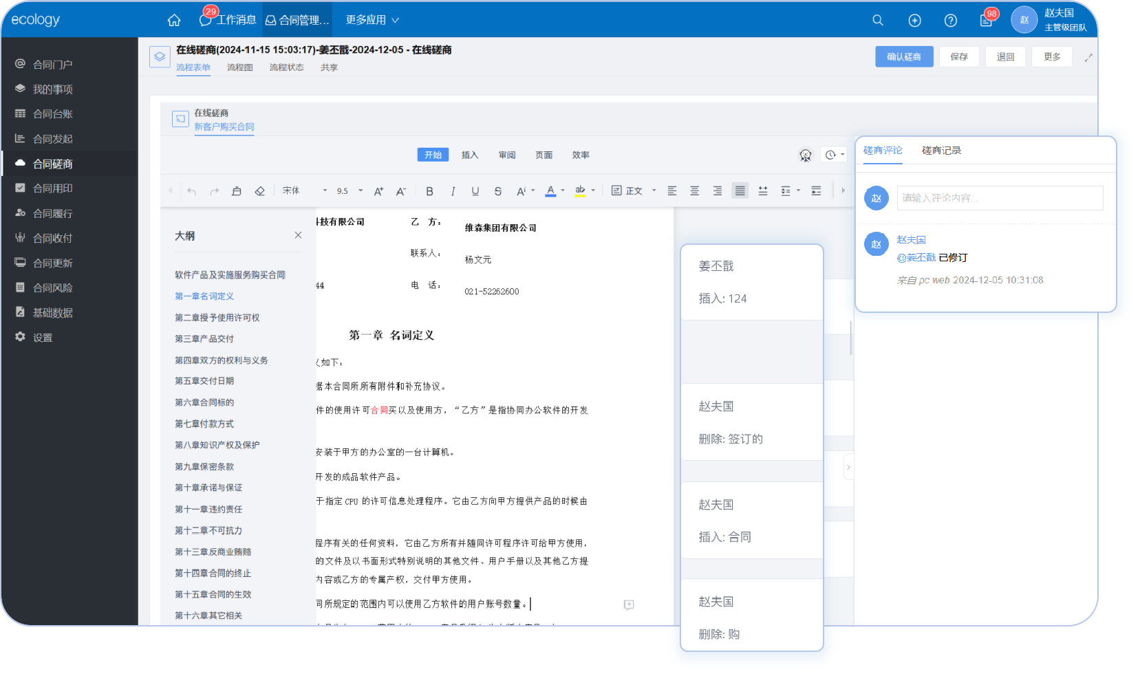 · 与供应商线上智能磋商合同内容:采购合同的具体条款如何编写,可以直接通过在线磋商功能与供应商在线协同编辑,智能交换编辑意见、操作留痕,高效拟稿。